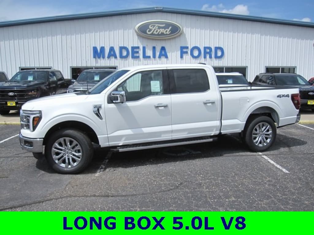 Star White Metallic Tri-Coat 2025 Ford F-150 Lariat 4WD 10-Speed Automatic 5.0L V8 This Ford F-150 is well equipped and includes these key features and benefits, F-150 Lariat, 5.0L V8, 4WD, 2nd Row Heated Seats, Ambient Lighting - Ice Blue Color Only, Console Worksurface, Electronic Locking w/3.31 Axle Ratio, Equipment Group 502A High, Garage door transmitter, Heads-Up Display, Illuminated Driver & Passenger Visors, Mobile Office Package, Partitioned Lockable Rear Storage, Power-Sliding Rear Window, Radio: B&O Unleashed Sound System by Bang & Olufsen, SYNC 4 w/Enhanced Voice Recognition, Wheels: 20" Chrome-Like PVD, Wireless Charging.